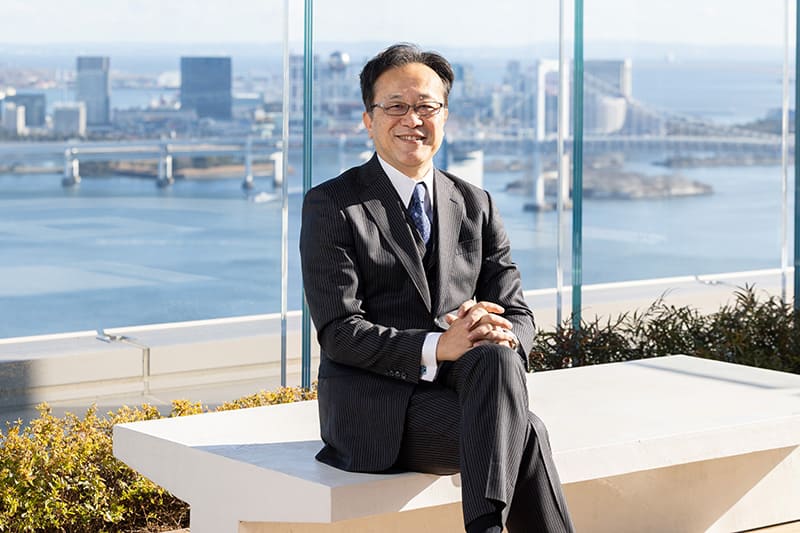 The office window looks out over Tokyo Bay and the recently redeveloped districts of Harumi and Toyosu. To the right is the Odaiba bayfront skyline and the Rainbow Bridge connecting...
