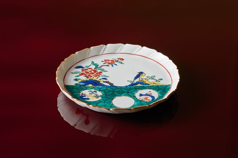 Kutani ware is a traditional colored porcelain from Ishikawa Prefecture. Its origins can be traced back to 1655, when Maeda Toshiharu, lord of the Daishoji domain (the present-day city of Kaga), a branch of the Kaga domain, ordered his samurai to study ceramics at Hizen Arita (the present-day Saga Prefecture town of Arita and its surrounding areas) and then had them start producing it themselves in a deliberate attempt to develop a local industry. Kutani ware is characterized by a vibrant and elegant glaze decoration that uses the so-called Kutani five colors: green, yellow, red, purple and ultramarine. The plate pictured is from the mid- to late Edo Period (1603-1868).