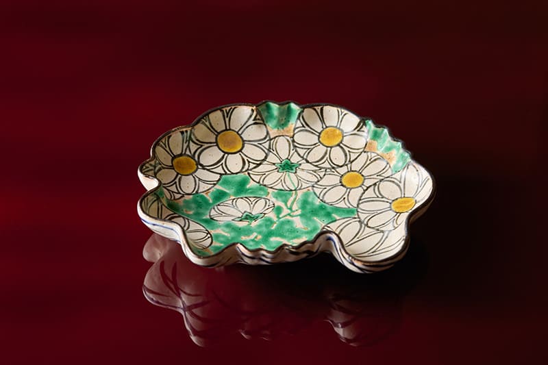 Pottery pieces made by reproducing the techniques and style of Kyoto-style potter and painter Ogata Kenzan, who was active from the late 17th century to mid-18th century, are extremely popular and still widely produced today. Characterized by vivid colors and pop designs, even a single Kenzan reproduction can immediately brighten and elevate an occasion. The photograph shows a chrysanthemum plate copied in the 20th century by Eiju Yaguchi, the first master craftsman of Kutani ware from Kanazawa, Ishikawa Prefecture.