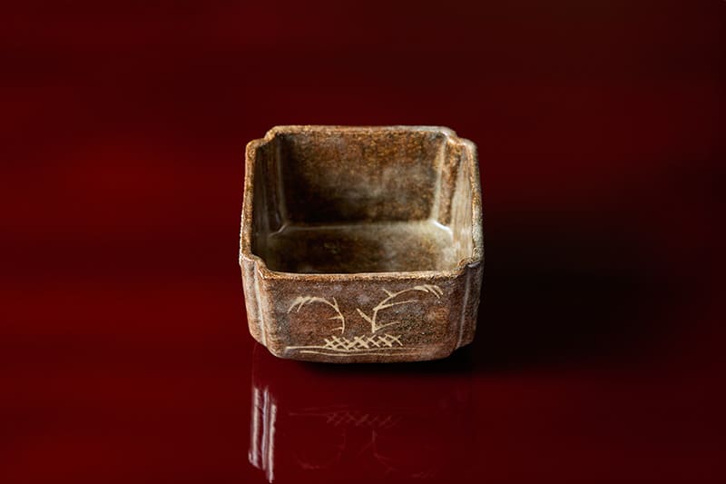 Pottery fired in Mino (present-day Gifu Prefecture) using white glaze, approximately 30 years before the start of the Edo Period. A Shino ware tea bowl bearing the signature “Umekake” is one of only two domestically produced tea bowls designated as National Treasures. The photograph shows a tsukemono (appetizer) dish made by the 12th-generation head of the Raku family in Kyoto, Hiroiri (his name after retirement), using Raku clay. It replicates Shino ware known as “nezumi Shino” (mouse Shino) due to its color, and depicts autumn grasses.
