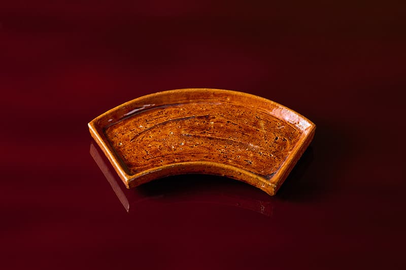 Ohi ware is one of Ishikawa Prefecture’s leading tea ceremony ceramics, originating in 1666 when the fifth lord of the Kaga domain, Maeda Tsunanori, invited Senso Soshitsu, the fourth head of the Urasenke school of tea ceremony, from Kyoto to Kanazawa. Accompanying him was the first-generation Chozaemon, a senior disciple of the fourth-generation Raku family master, Ichinyu (his name after retirement). Chozaemon began producing tea bowls and other pieces in Ohi, a village outside Kanazawa. The photograph shows a fan-shaped appetizer dish by the sixth-generation Chozaemon that is characterized by its lustrous brown ame-yū glaze.