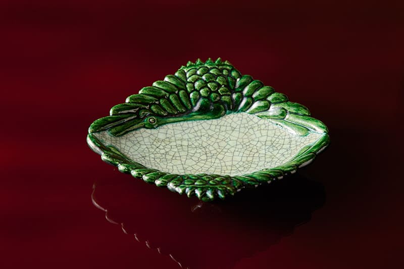 Raku ware traces its origins back to the late 16th century, when the potter Chojiro created the first Raku tea bowl at the direction of Sen no Rikyu, the man famous for perfecting the tea ceremony. Generations of heads of the Raku family in Kyoto have since taken the name Kichizaemon, producing primarily hand-formed tea bowls, as well as tableware for formal kaiseki restaurants. The photograph shows a vessel shaped auspiciously in the form of two facing cranes that was created by the 11th-generation master, Keinyu (the name he adopted after retiring). Its vivid green glaze is beautiful.