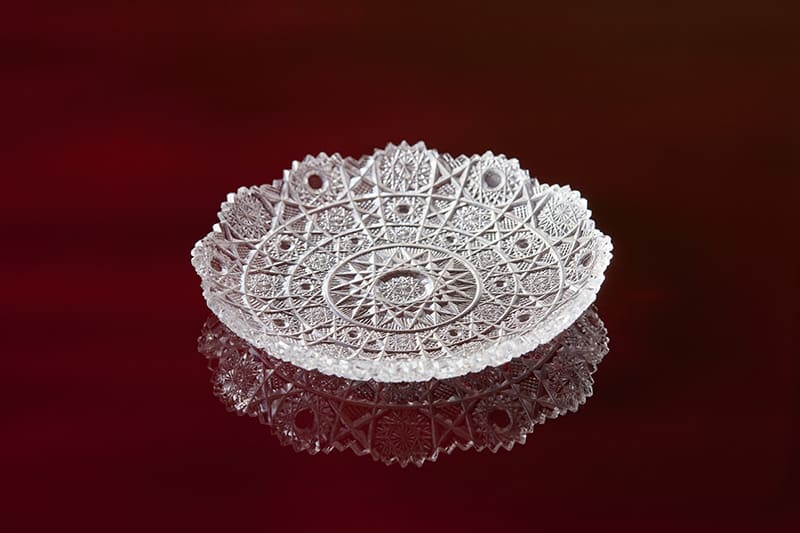 A general term for cut-glass products crafted in Edo (Tokyo) from the late Edo Period (around the 19th century) to the present day. It is said to have originated from applying cut-glass decoration to glassware imported from overseas. In addition to tableware, it includes daily necessities such as goldfish bowls. The plate pictured is a custom-made piece commissioned by the previous owner of the Japanese restaurant Zeniya, who had Edo kiriko artisans replicate the Bohemian design of a 19th-century cut-glass bowl.