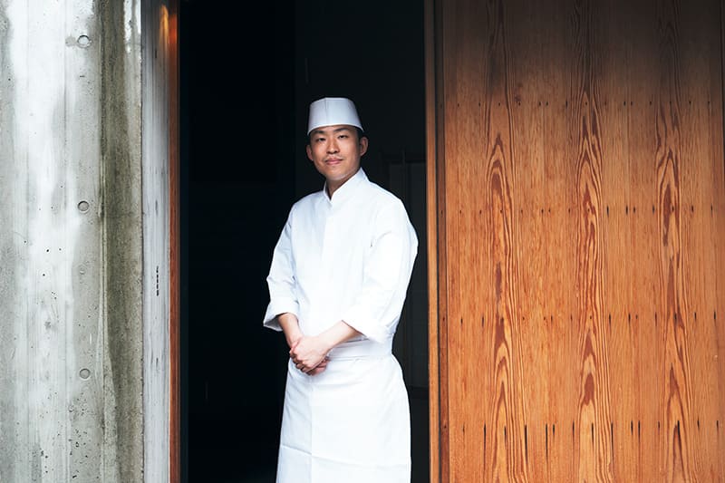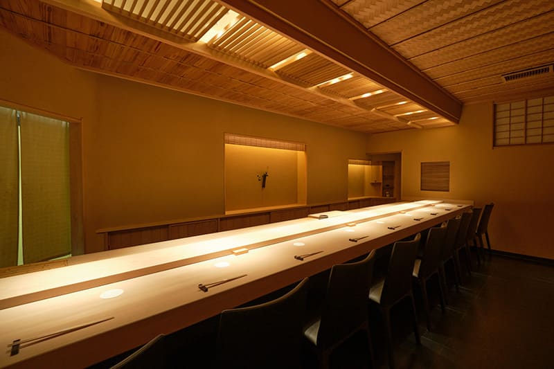 The interior brings to mind a teahouse, with features including a wickerwork ceiling made of Japanese cedar from Ehime. The counter, which is fragrant with the fresh scent of wood, accommodates eight diners. The omakase menu, priced at ¥27,500 ($180) including tax, is served in two seating periods starting at 5 and 7:30 p.m. Seventy percent of the guests are visitors from outside the prefecture, 10% of whom are tourists from other countries, mainly in Asia.