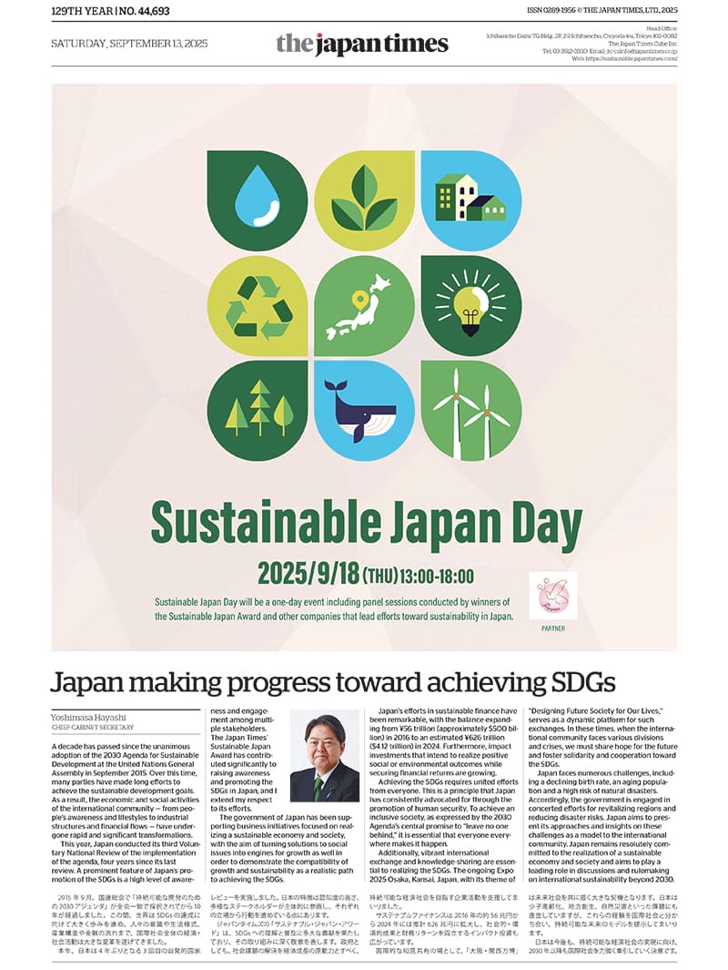The Japan Times is proud to announce that applications are now open for the 8th edition of the Sustainable Japan Award. Since 2017, we have been recognizing companies, organizations, and individuals making significant contributions toward a more sustainable society.